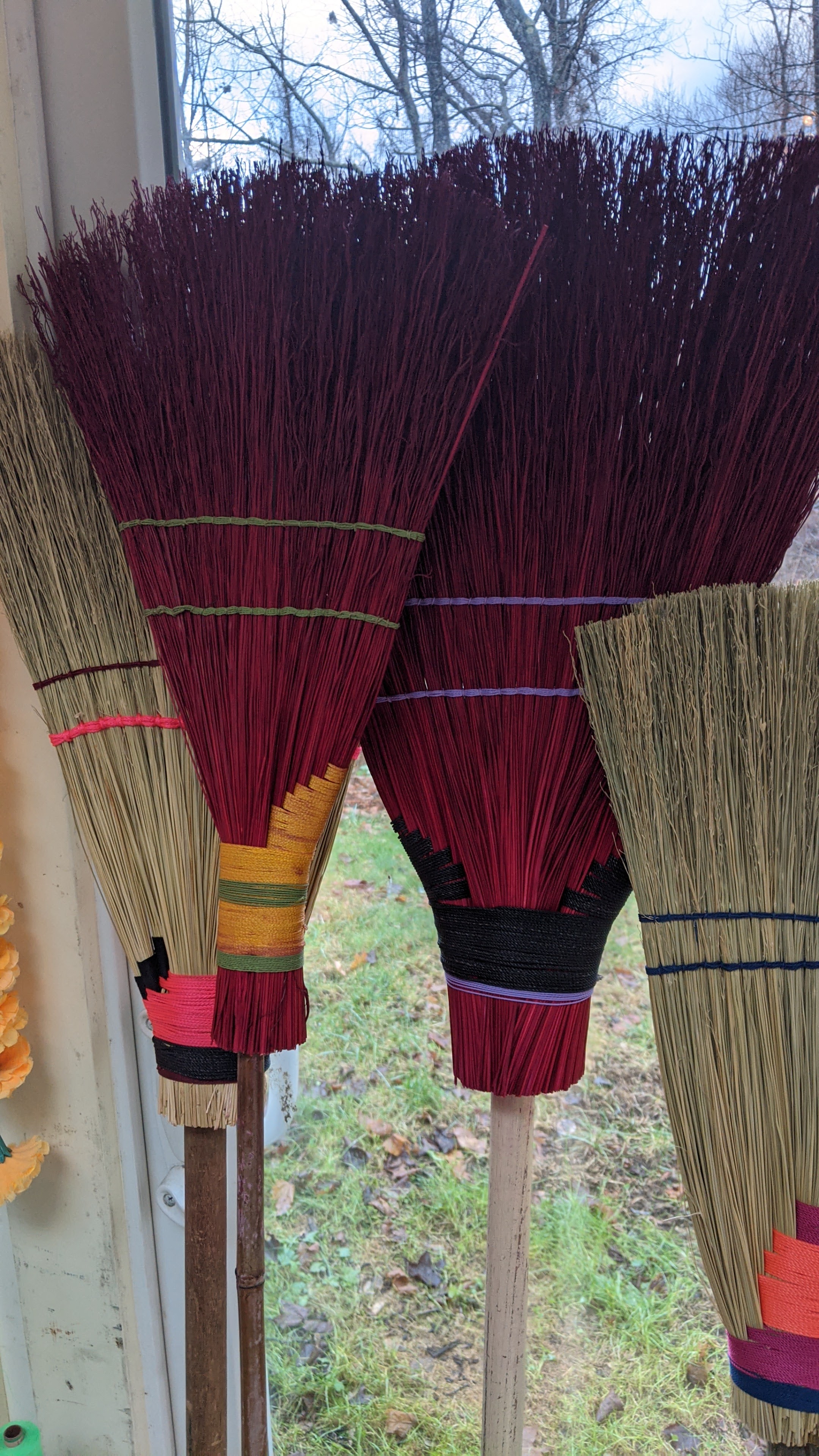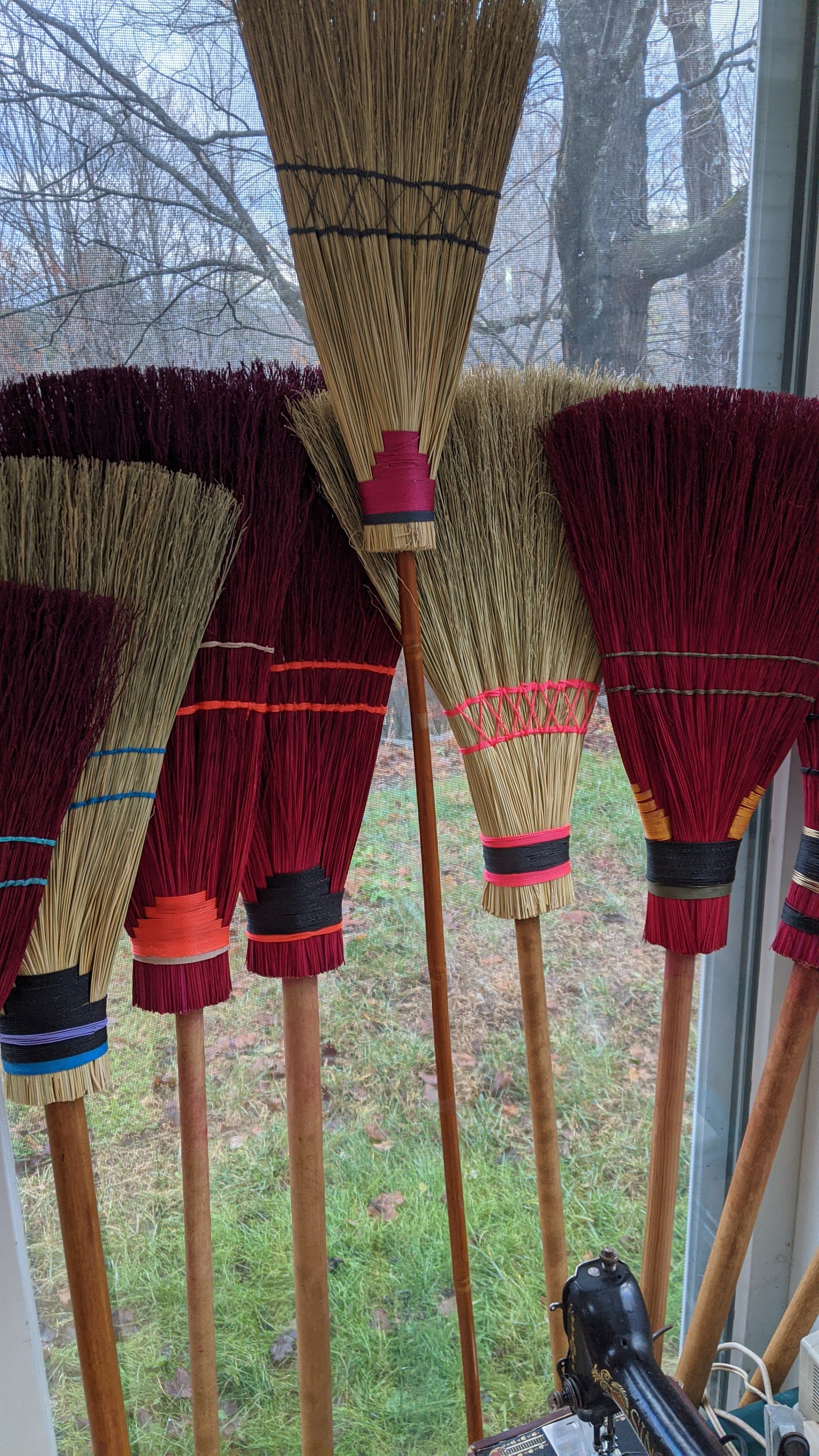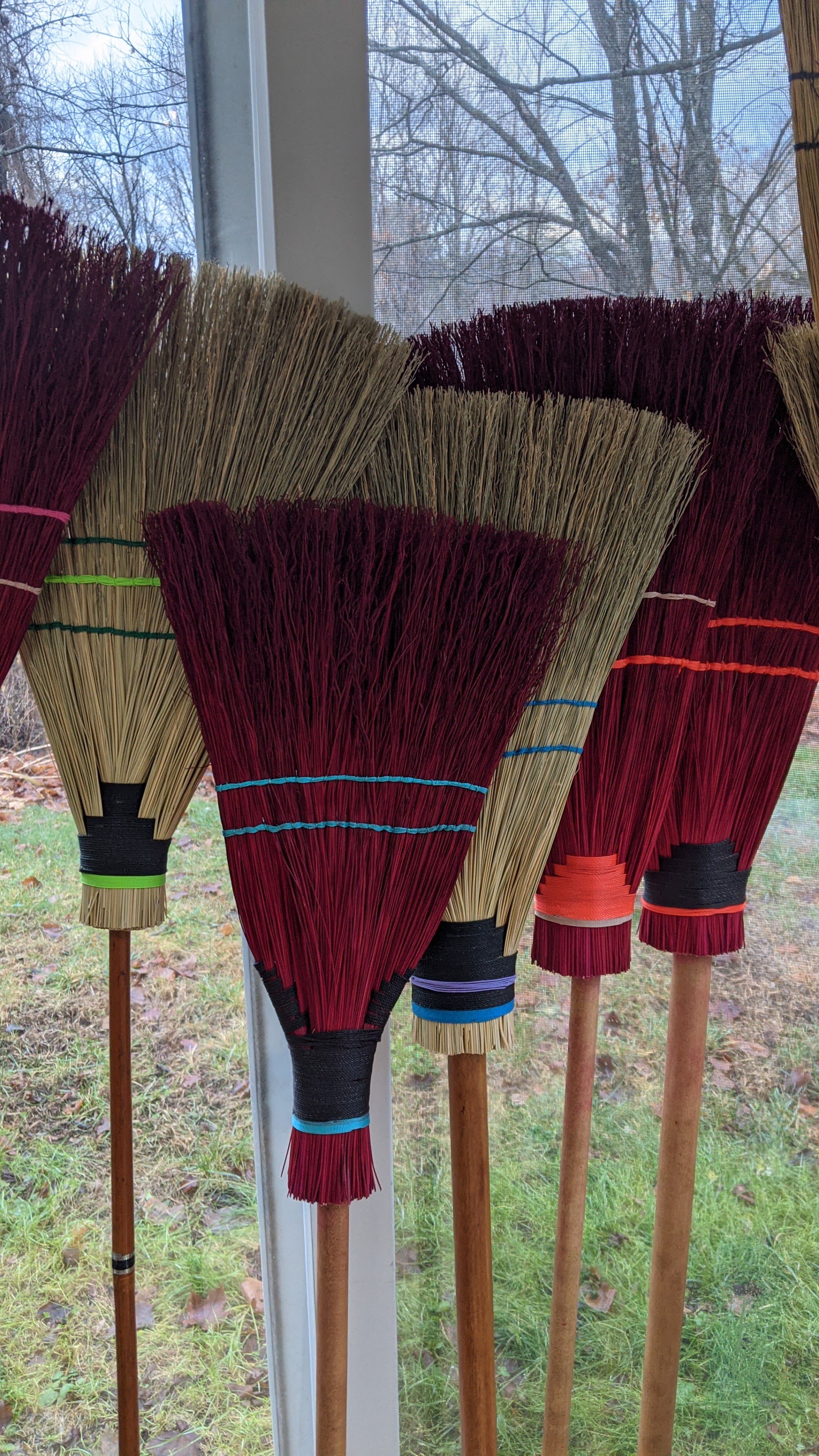 All my brooms are made entirely by hand and each one is unique. I use broom corn/ hurl grown in Mexico and my handles are a combination of dowels, poles, discarded tool handles, lone ski poles, doorknobs and various found objects. I make full size sweepers as well as whisks and smaller brooms. They are fully functional and meant to be used. See my newest work and what is available to purchase on Instagram @thinairgoods message me for prices, availability and shipping.